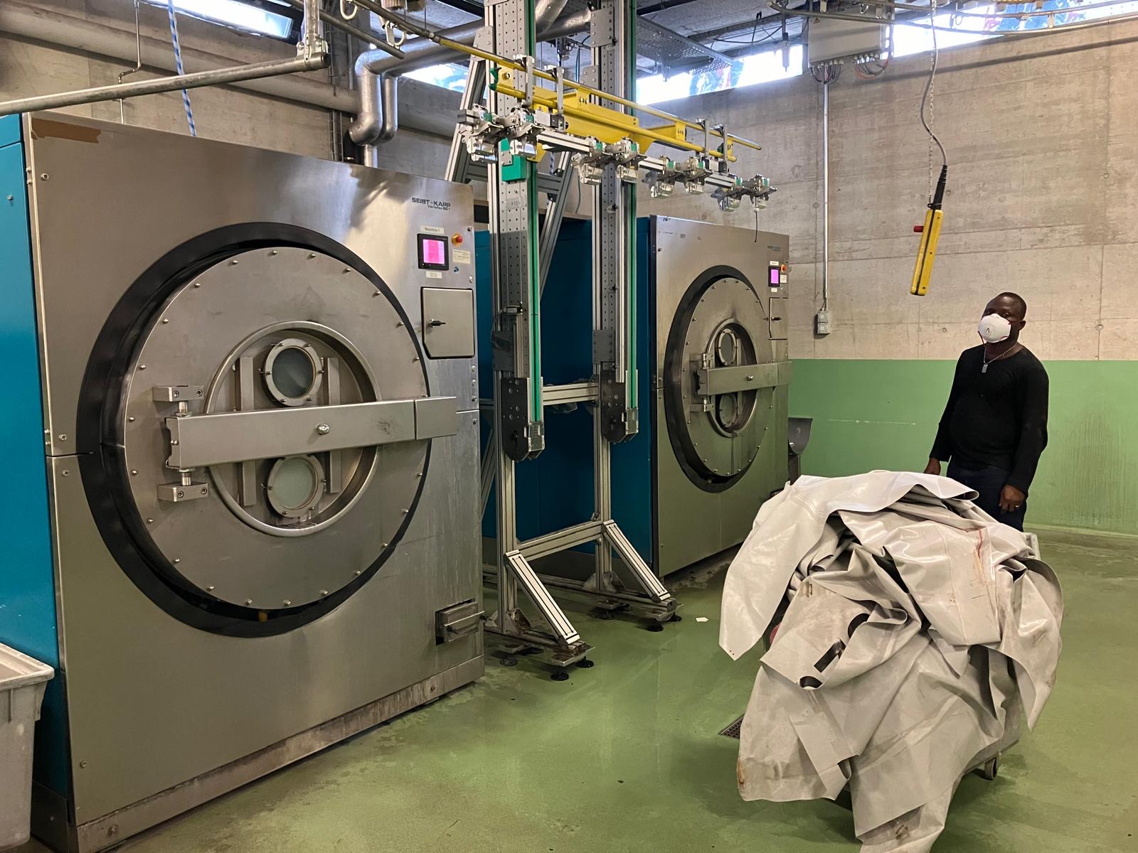 Visite de l’usine de sac « Freitag », entreprise qui utilise de vieilles bâches de camion pour en faire des sacs à main, porte-monnaie et autres.